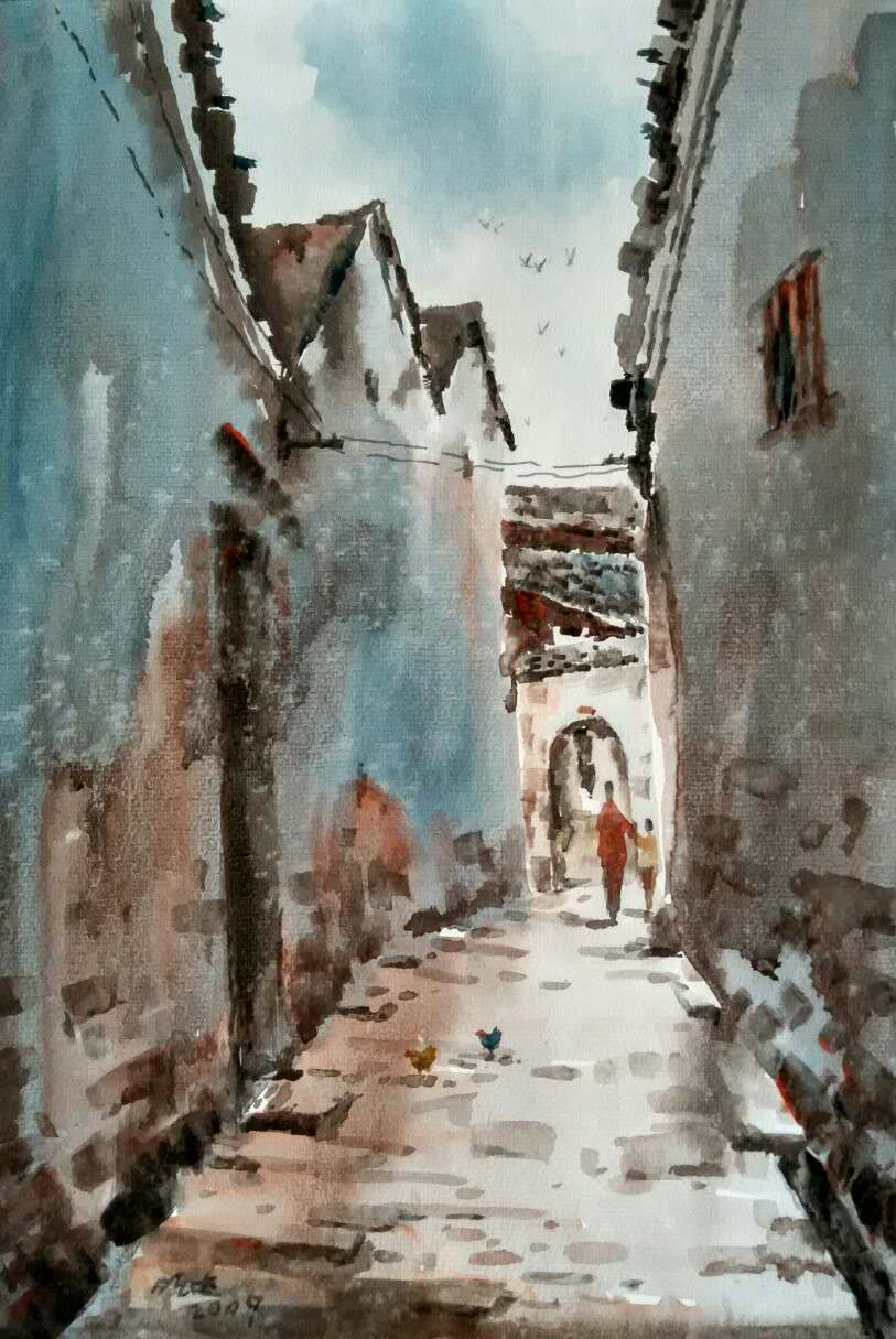 看 他的画最要看色彩。他处理色彩关系的扎实基本功是不能自学的。他那《阳光下的巷道》系列作品用色之明快响亮,冷暖之对比和谐,笔触之肯定果断,暗部之准确 丰富,真是耐人寻味。还有那轻松洒脱的《阳光下的旅人》,淳厚朴实的《乡村小路》,灵动率性的《雨中情》,沉郁苍拙的《乡村暮色》等,都是可供细细品味的 佳作。