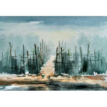 画如其人。崔明达水彩作品总是那么沉静,那么从容,那么朴实,那么坦诚。他的画里常见逸笔,多呈逸境,看上去往往几近“逸品”了。他作画不以大势奇崛取胜,而常以一种平和散淡去亲和自然。他画的多是常见的桂北乡村小景,村边的小溪、屋后的菜园、路边的竹篱、坡上的草垛,无不是他意有所属,情有所钟,可见一种博爱的胸怀。生于斯,长于斯,甲天下的桂林美景陶冶了他的情趣,也保留下他不变的纯真。