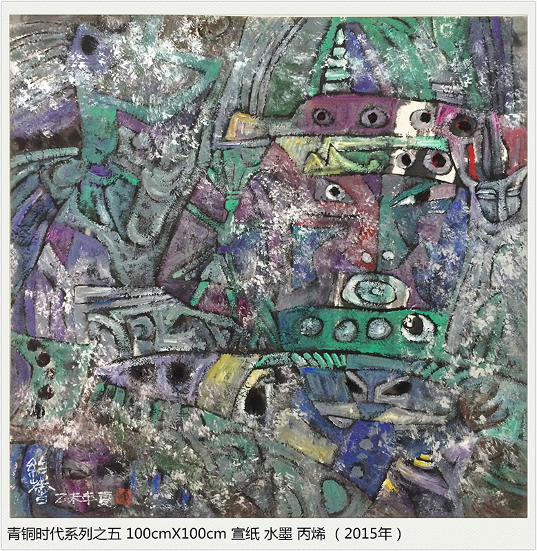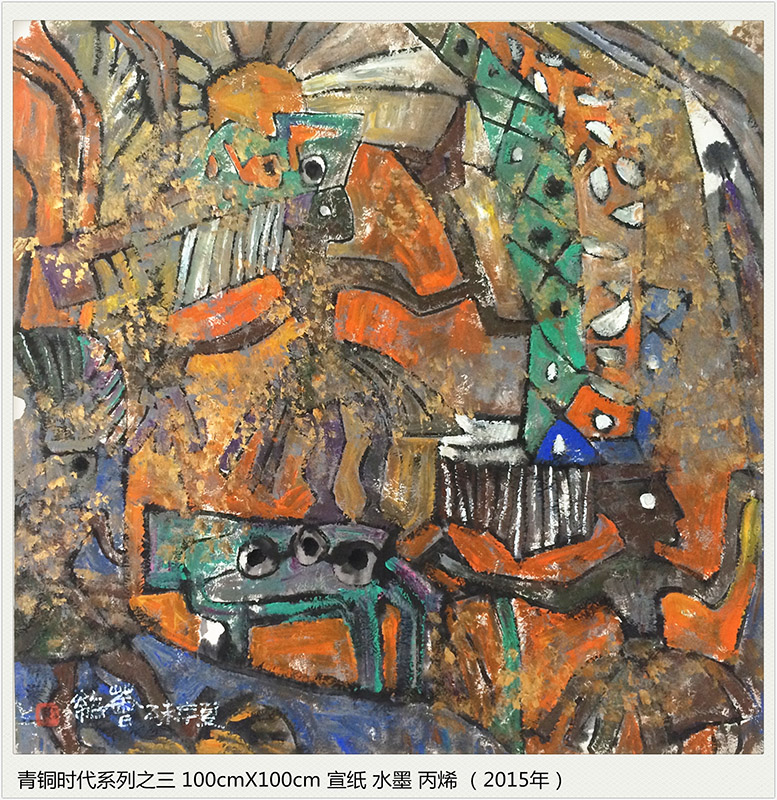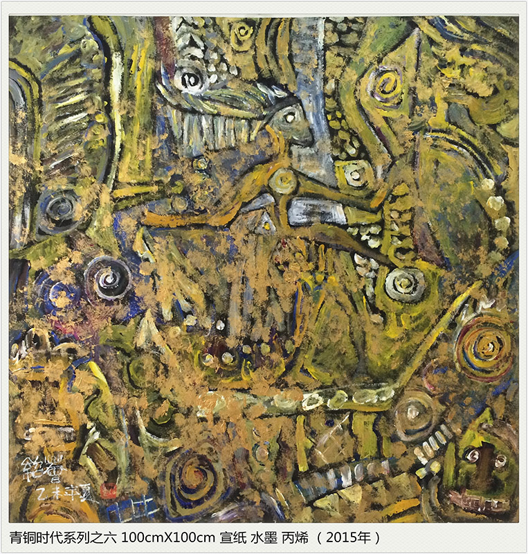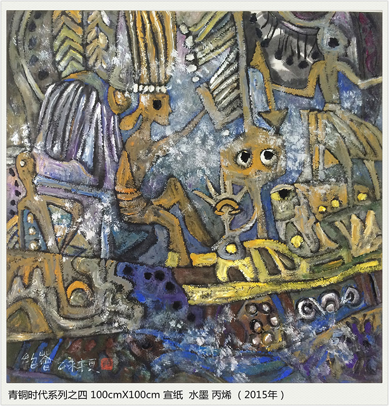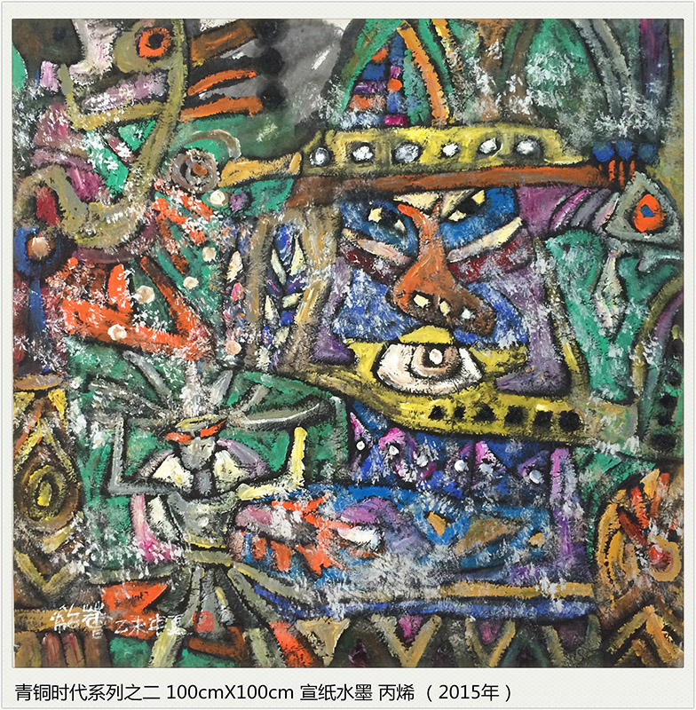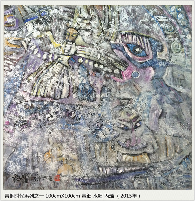 点与线的交错,色与光的融炼,经历了时光岁月的磨砺,化为生命宇宙交合的永恒 。我试图在造型元素纯粹的本体中找出与我们现代生命某些契合的原点,在遥远、朦胧、苍茫的时空流逝中发现新的亮点,也许,青铜时代的原光能化为追寻现代梦的某些灵感。